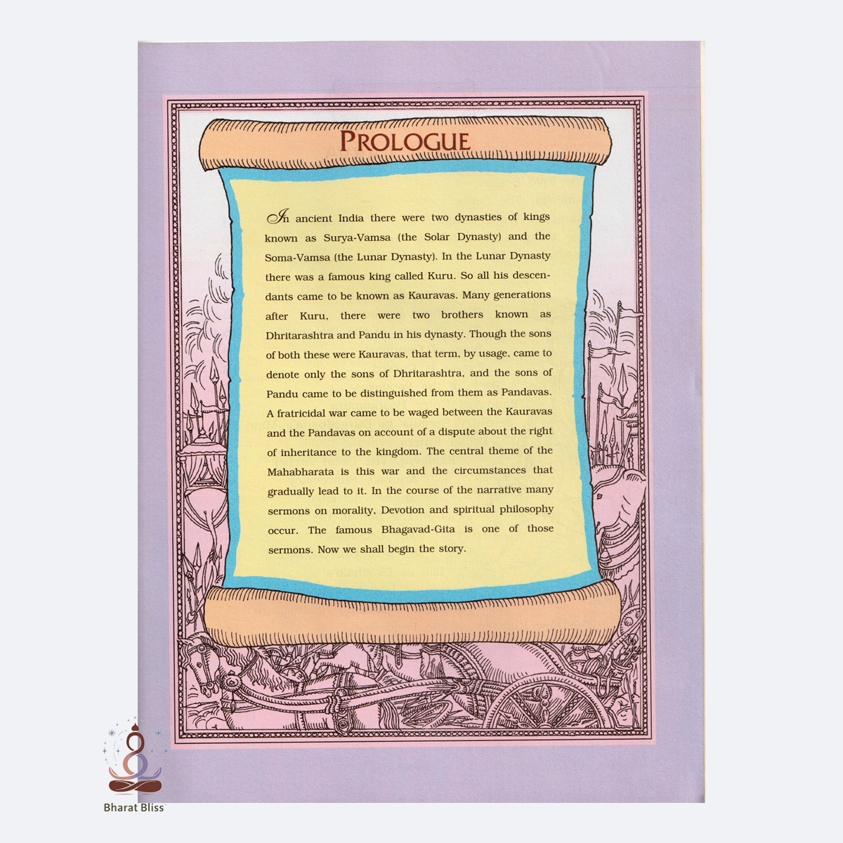 Description: Conches blow. Banners wave. Arjuna hesitates to fight his kin, and Krishna delivers the Bhagavad Gita atop a golden chariot.